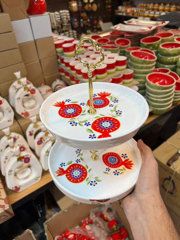استند دو طبقه سرامیکی طرح انار، مناسب برای سرو شیرینی، خشکبار و تزئین میز پذیرایی. طراحی سنتی و زیبا با کیفیت بالا و پایه فلزی مقاوم. انتخابی عالی برای مهمانیها و هدیه.