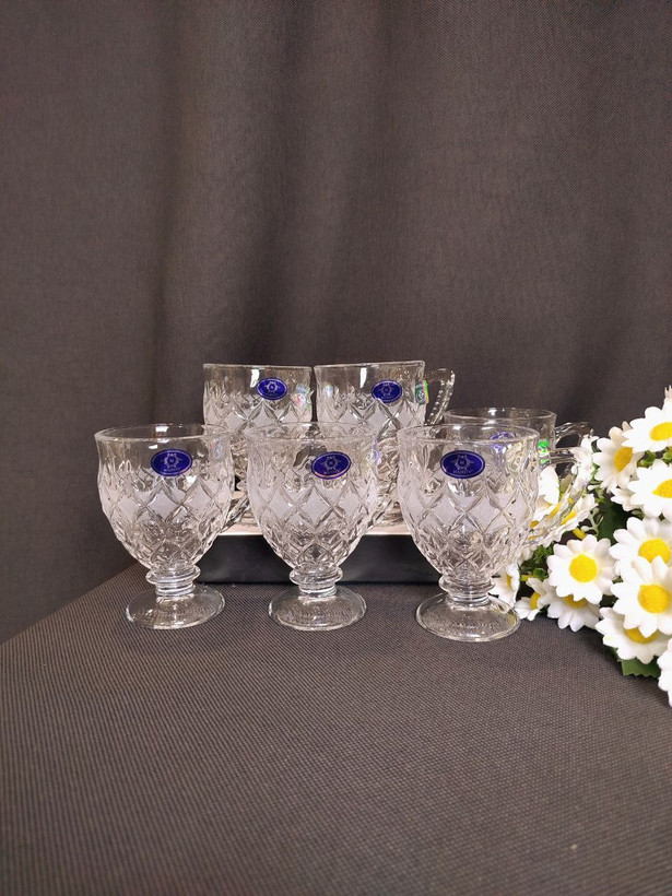 لیوان شیشهای پایهدار با طراحی برجسته و طرح کریستالی، دارای دسته برای استفاده راحتتر. مناسب سرو انواع نوشیدنیهای گرم و سرد و گزینهای ایدهآل برای پذیرایی و هدیه.