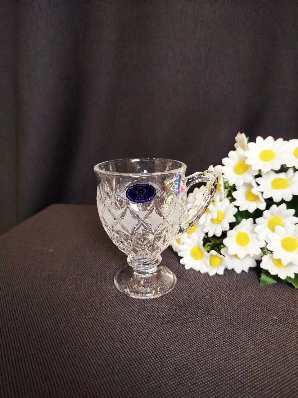 لیوان شیشهای پایهدار با طراحی برجسته و طرح کریستالی، دارای دسته برای استفاده راحتتر. مناسب سرو انواع نوشیدنیهای گرم و سرد و گزینهای ایدهآل برای پذیرایی و هدیه.